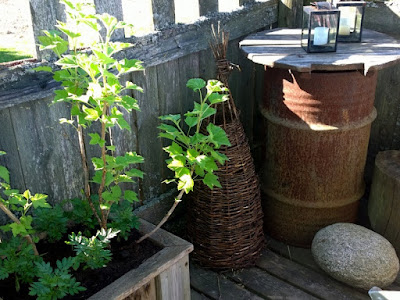 Grilliaitauksessa talvehti marjapensas kukkalaatikossa. Olen tuon jostain poimnut talteen enkä edes tiedä kumpi on, punainen vai musta. Samettiruusujen kukinnan alkamista odottelen juurelle.
